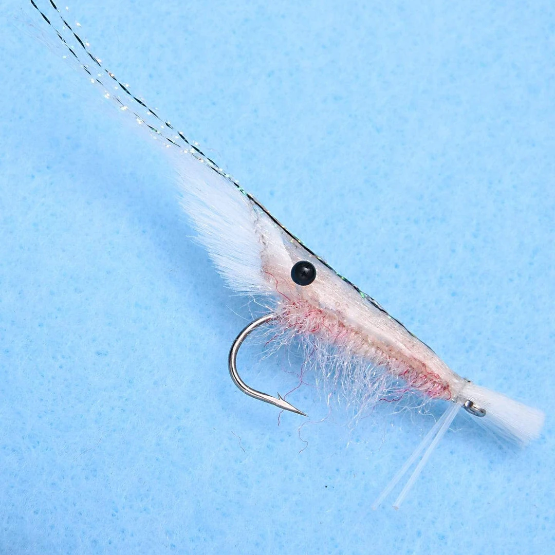 A pretty spot on grass shrimp imitation for striped bass in estuaries, flats and ponds in New England. This fly is 2.5″ long and comes with a monofilament weed guard. Â