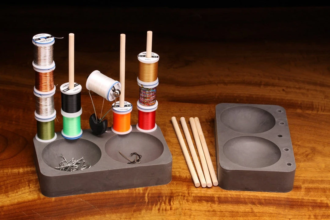 Fill the bowls with hooks, beads and the like; add wooden dowls to easily stack up to 20 thread spools. Become a more organized and efficient tyer with this caddy.Â
