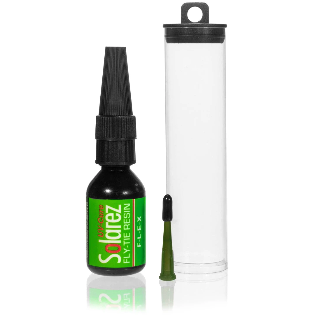 The “F-L-E-X” version is great for all kinds of flies, it is especially valuable for anglers who fish around structure as it is less likely to crack or brake after an accidental encounter with a rock or jetty. It can also be used to repair waders or coat knots. *Tying note, this resin requires slightly more irradiation than other resins to fully cure, give it some extra time under your UV light*.Â