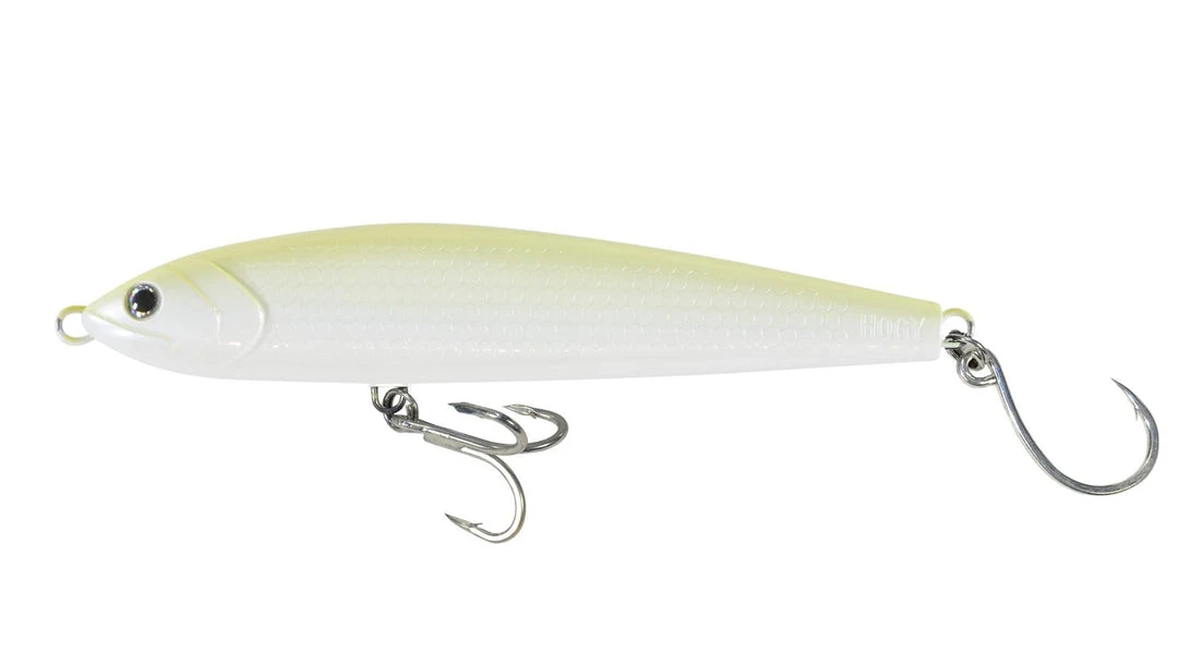 Hogy’s Charter Grade Dog Slider is the little brother of the Hogy Charter Grade Slider. This is smaller version is more suited towards inshore and lighter offshore use, whether it be for stripers, tuna, bluefish or any other predatory gamefish. The size profile of this lure mimics ticker mackerel, herring, mullet, and many other mid size baitfish well. Out of the package, each Dog Slider is equipped with a 1/0 VMC 9626 Treble and a 3/0 VMC 7266 inline hook. This lure was designed under typical conditions to fish 2-3 feet below the surface with a slow side-to-side wobble with little effort by the angler to utilize. Â