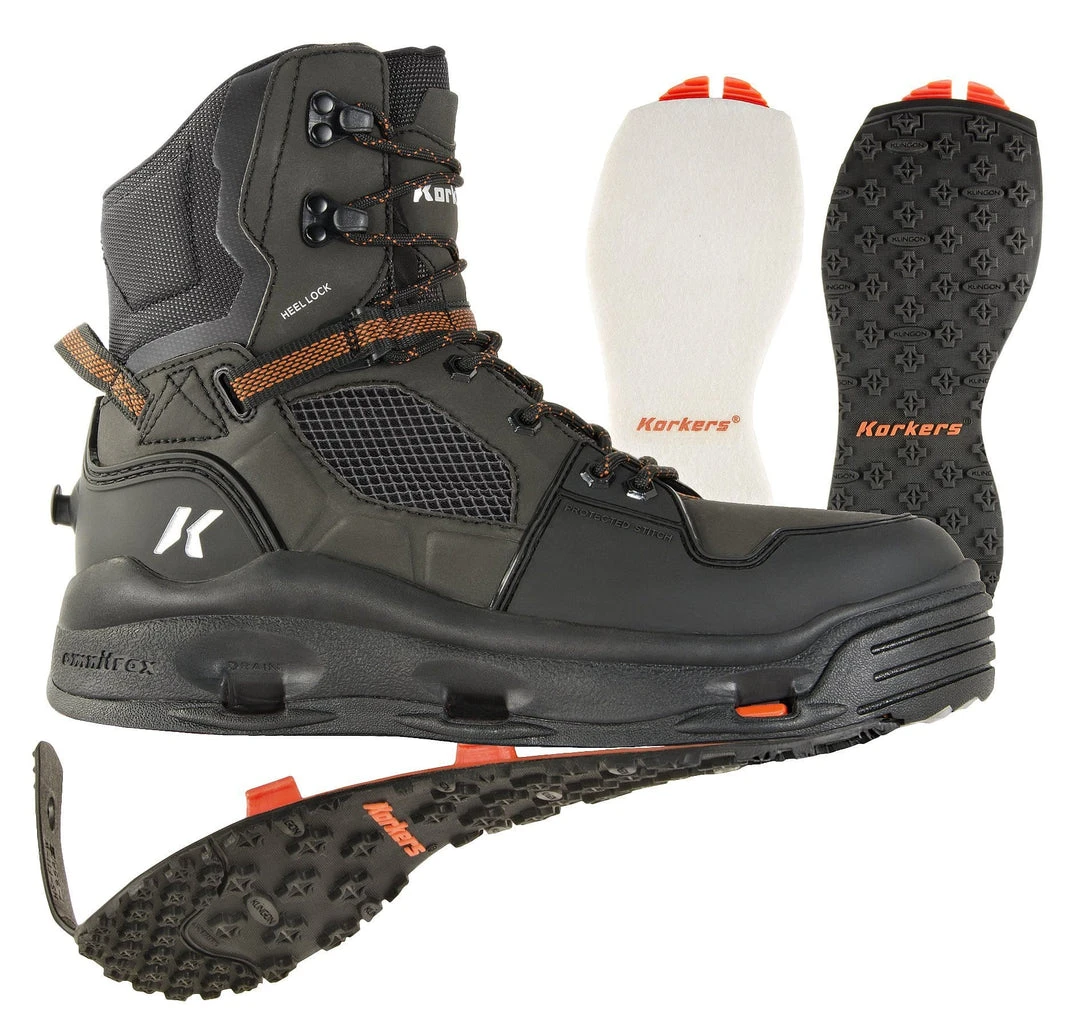 For those who are rock hopping, hiking around to the next spot, wet suiting, or patiently waiting in the elements for the next bite, one of the great qualities of this boot is its comfort. Korkers has developed their own blend of flexibility/comfort known as “Heel Lock”. The idea is to provide the user with a boot that provides good ankle/foot support for when they are stepping on uneven terrain but keeps the boot lively enough to naturally maneuver. Â