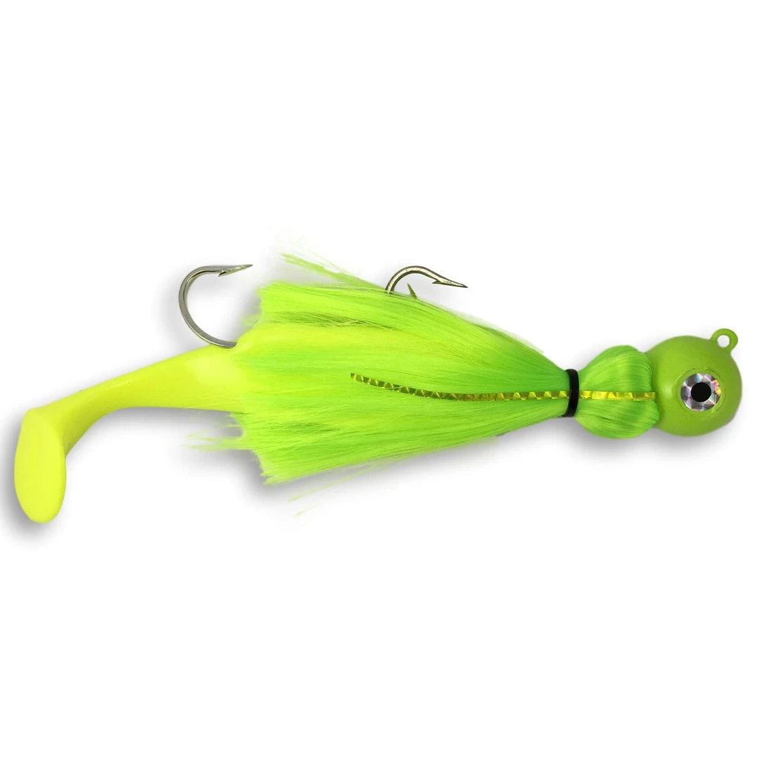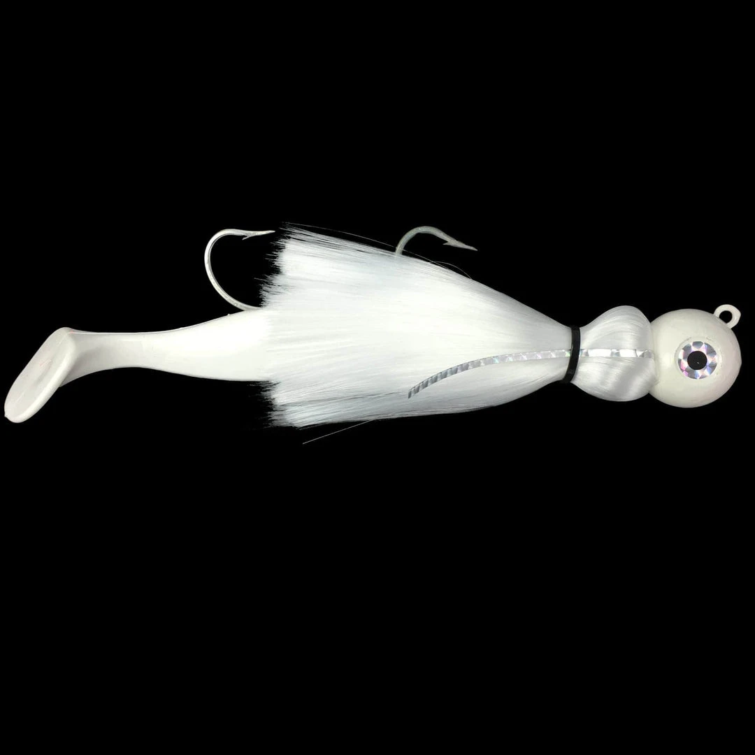 Magic Tail Mojo Rigs utilize a ball jig with a durable swim shad and skirt with two Mustad hooks rigged inline. They are available in 8, 16, 20 and 24 oz in white and chartreuse.