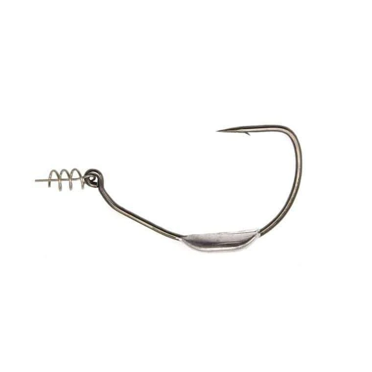 Owner Twistlock Beast Hooks with TwistLOCK Centering-Pin Spring (CPS) are designed for weedless-style rigging of larger plastics like big swimbaits and flukes. With its TwistLOCK Centering-Pin Spring (CPS – patent pending) attached to the hook eye, baits can be permanently secured by inserting the pin in the center of the nose of a soft plastic, which can then be screwed onto the TwistLOCK coil spring to rig perfect everytime! Different size springs are matched to hook size to maximize holding power. Quick-drop shank below eye allows for rigging fat-headed baits, and maximum gap allows for improved hook sets because of better bait clearance. The non-movable weight attached (5130W) not only helps to sink or swim a rigged bait down into the strike zone, but because the weight is positioned so low on the shank, it provides a keel effect. As a result, when rigging large swimbaits weedless-style, plastics swim naturally (as opposed to rolling or flipping where weights are inserted inside soft baits).