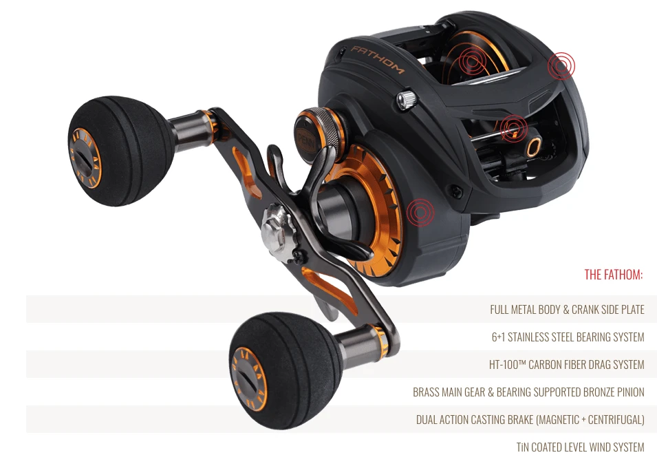 With the introduction of one of Penn’s first low profile baitcaster’s, the Fathom Low Profile Reels are built tough to handle your inshore and nearshore species. With a full metal body and side plate, these reels are outfitted with a brass main gear and bearing support pinion which offers a substantial drivetrain for maximum power delivery. A TiN coated level wind system and synchronized drag and level wind system (on only the 400 sizes) give the extra durability and strength needed under high drags. Its dual action casting breaking system provides for easy finetuning for great backlash free casting distance with minimal effort. For the inshore/nearshore market, the Fathom Low Profile Reels are a great rugged option to tackle the widly diverese species we have lurking our waters.