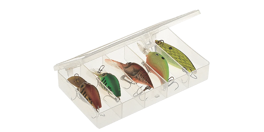 A simple and small utility box from plano, perfect for storing small jigs and other weights, and other accessories. This box features 5 fixed compartments and is clear for easy identification. Â