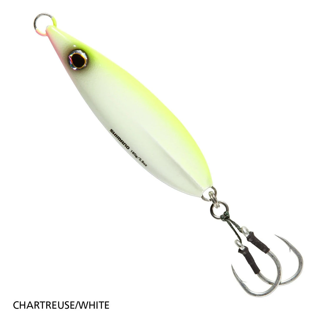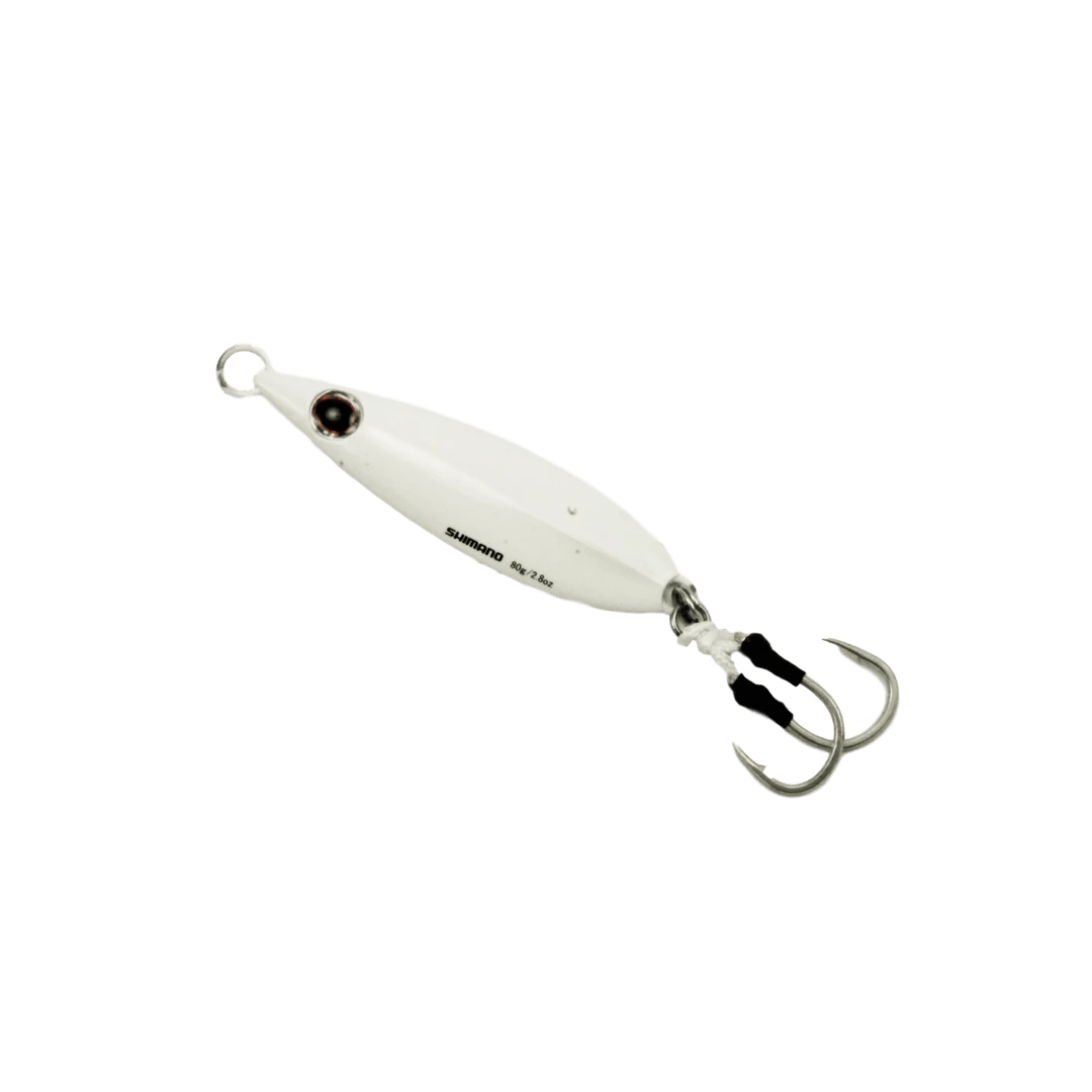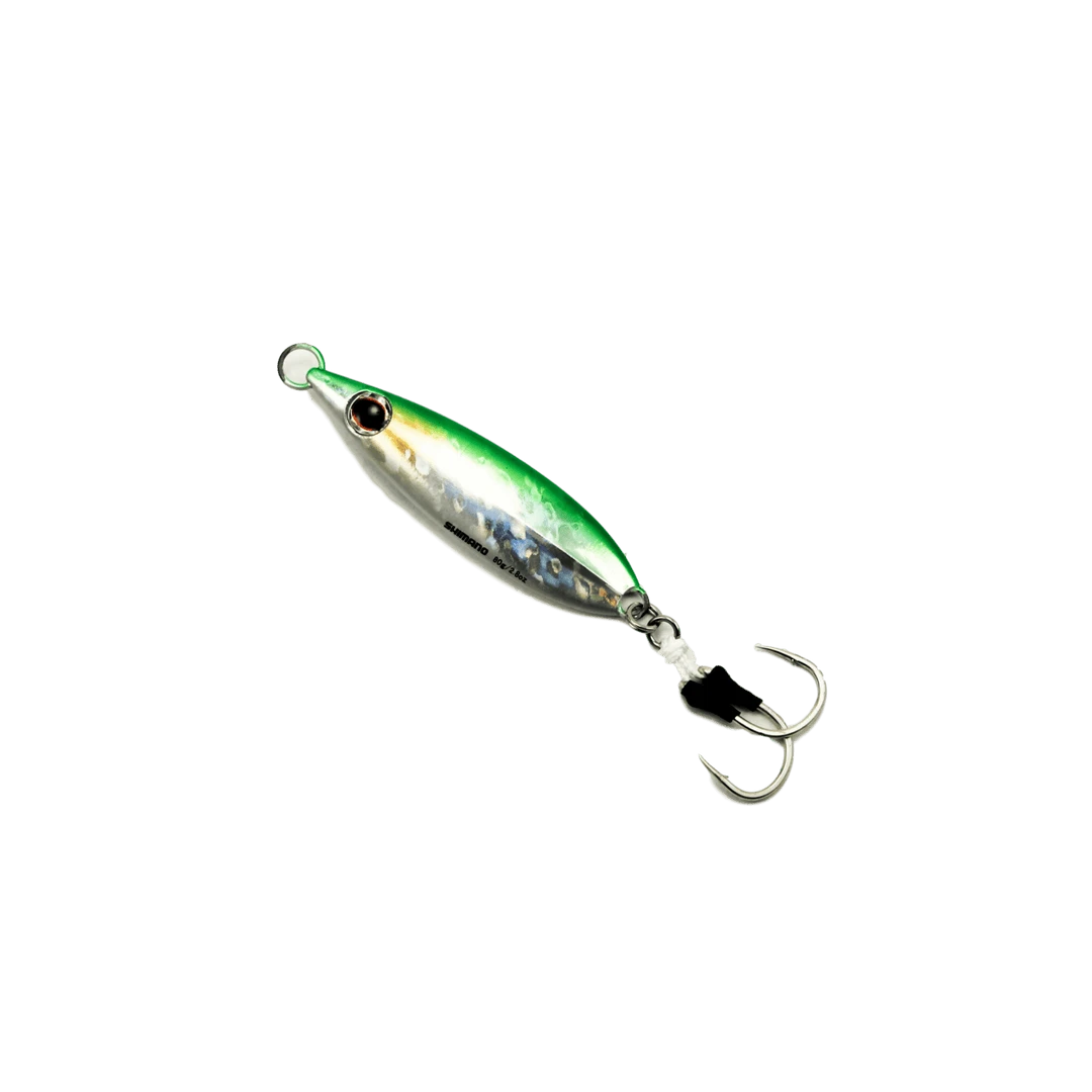 The center-balanced Shimano Flat-Fall Jig falls with a wobbling action in a horizontal attitude. Features 2 Owner Dancing Stinger hooks.