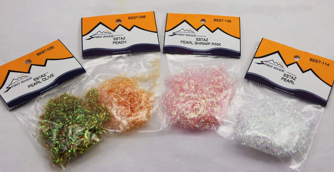 Estaz is a core-wrapped mylar similar in construction to chenille and about 15mm in diameter. It is a good material to add bulk in squid flies or deep bodied baitfish. For best results, be sure to fold back the fibers as you wind it up the shank.