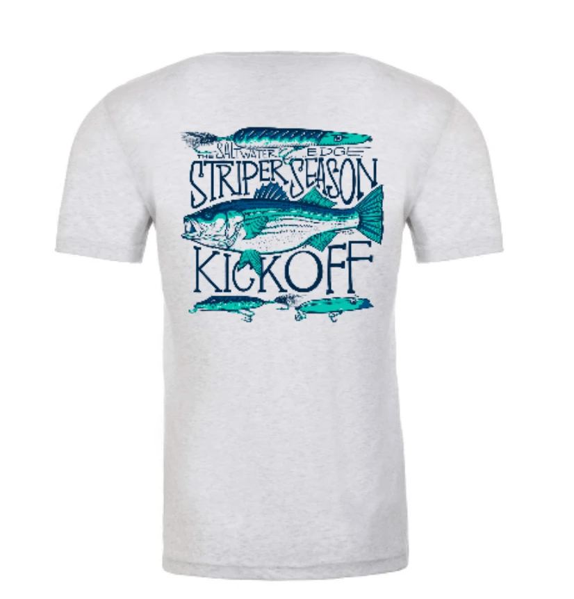 Limited edition shirt made for the 2022 Saltwater Edge Striper Kickoff. Front Saltwater Edge Logo and back logo by local artist Peter James Glenn. Printed on a comfortable tri-blend tee. Once these are gone they are gone!