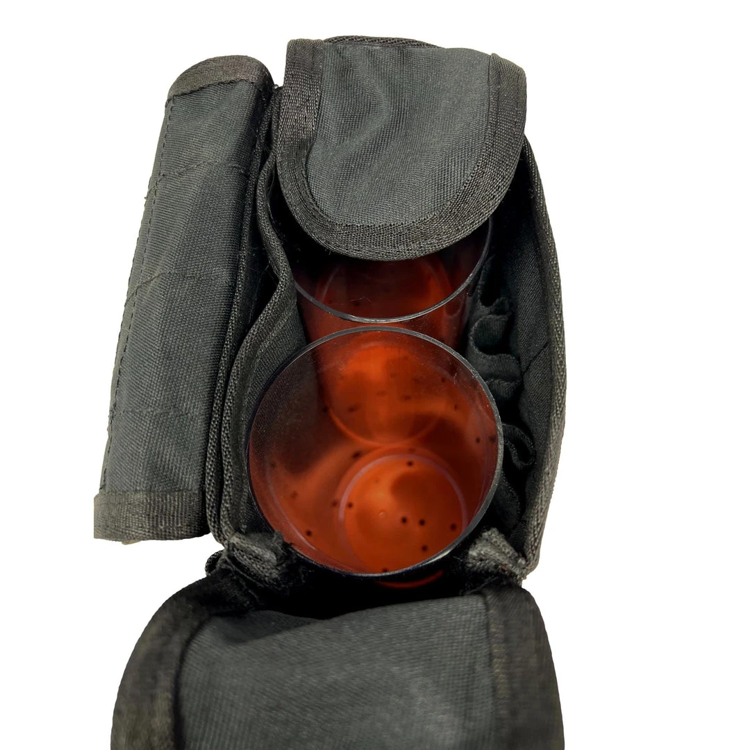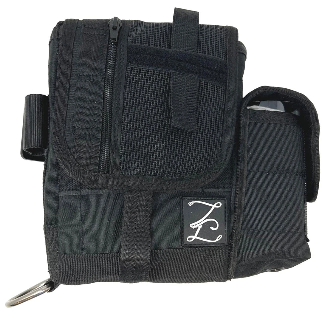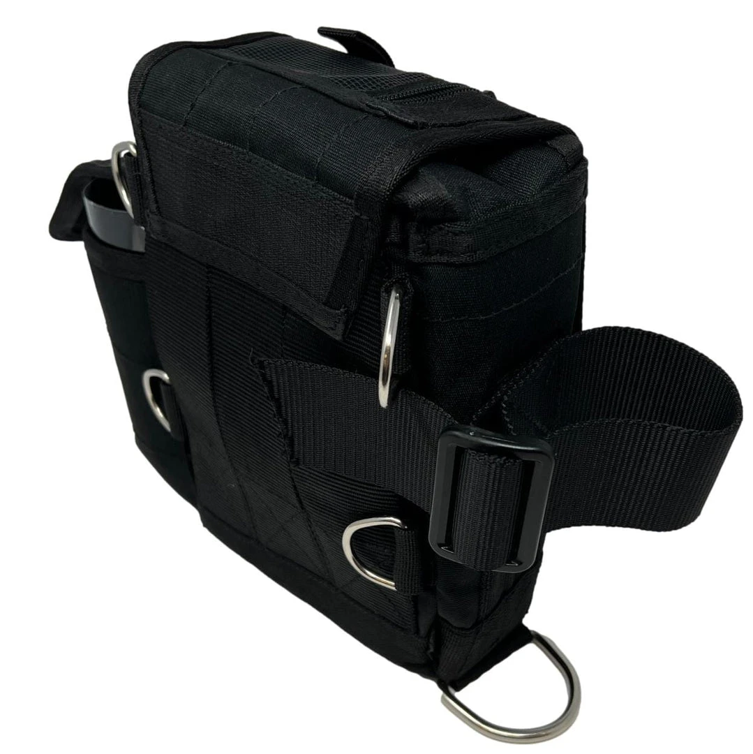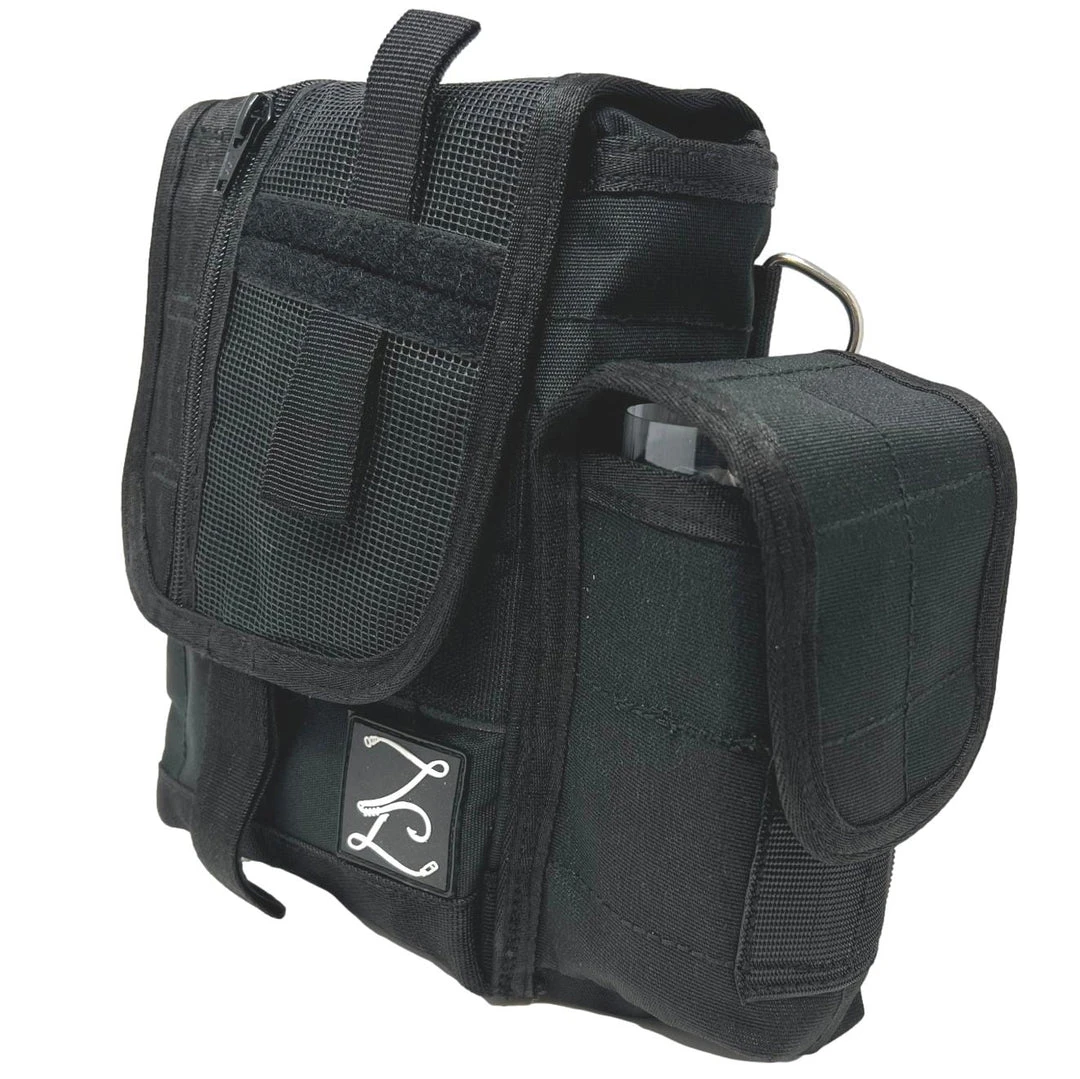 On the right side of the bag, a additional storage pouch allows for a shorter third tube and convert this bag into a three tube bag. It also fits other accessories and tools like a water bottle, buck tail trailers and more. On the left side of the bag, a short 2″ wide utility strap accommodates a variety of tools and gear. Small belt accessories like knives, pork rind holsters, plier sheaths and others fit well on the utility strap, while boga grips and other gripping tools fit when attached to the large D-ring and secured snuggly on the utility strap.